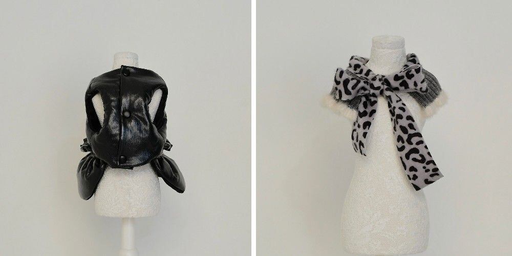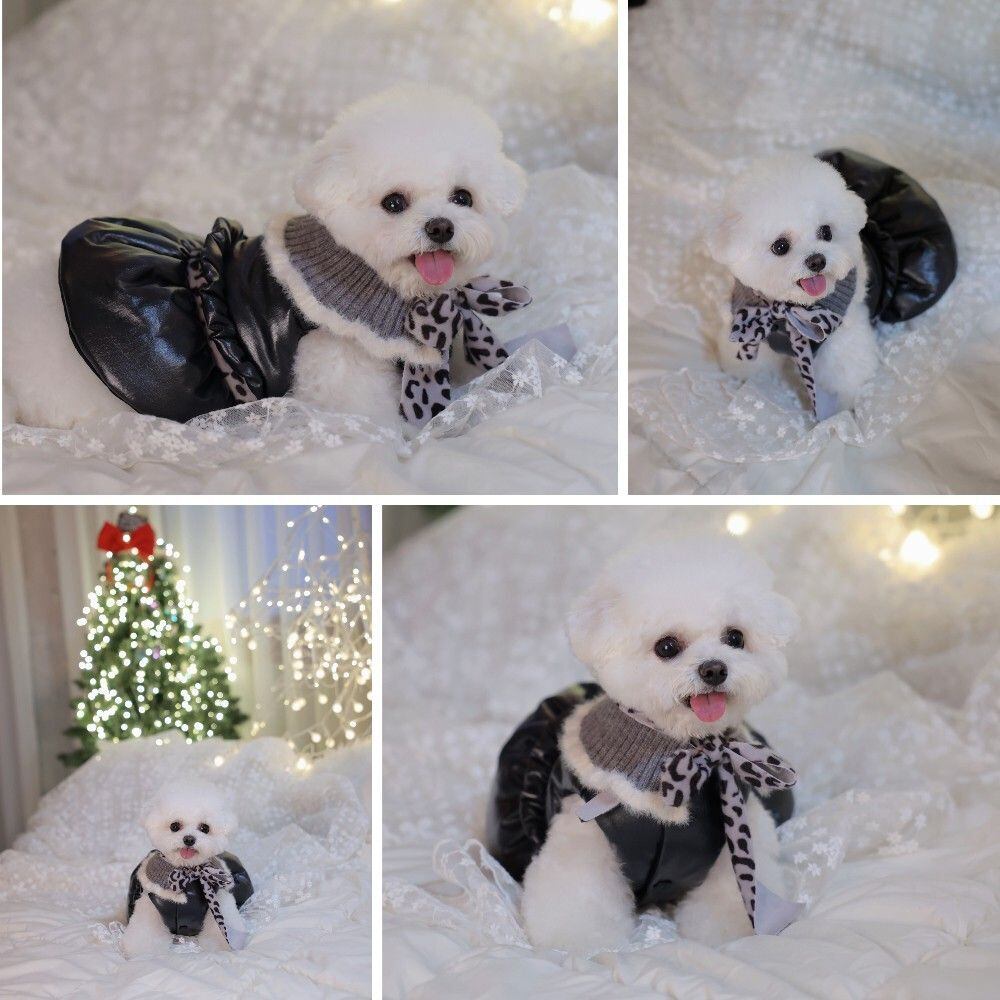 ■目を惹くデザイン 光沢のあるレザータッチのブラック生地を使用した、ちょっぴりクールでとってもキュートな犬用コート/ドレスです。