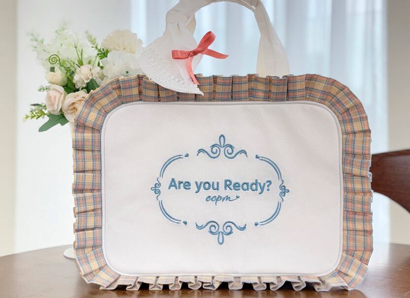 ■「Are you Ready?」の刺繍メッセージ バッグ中央には、お出かけ前のワクワク感を高めてくれるロゴ刺繍入り。
