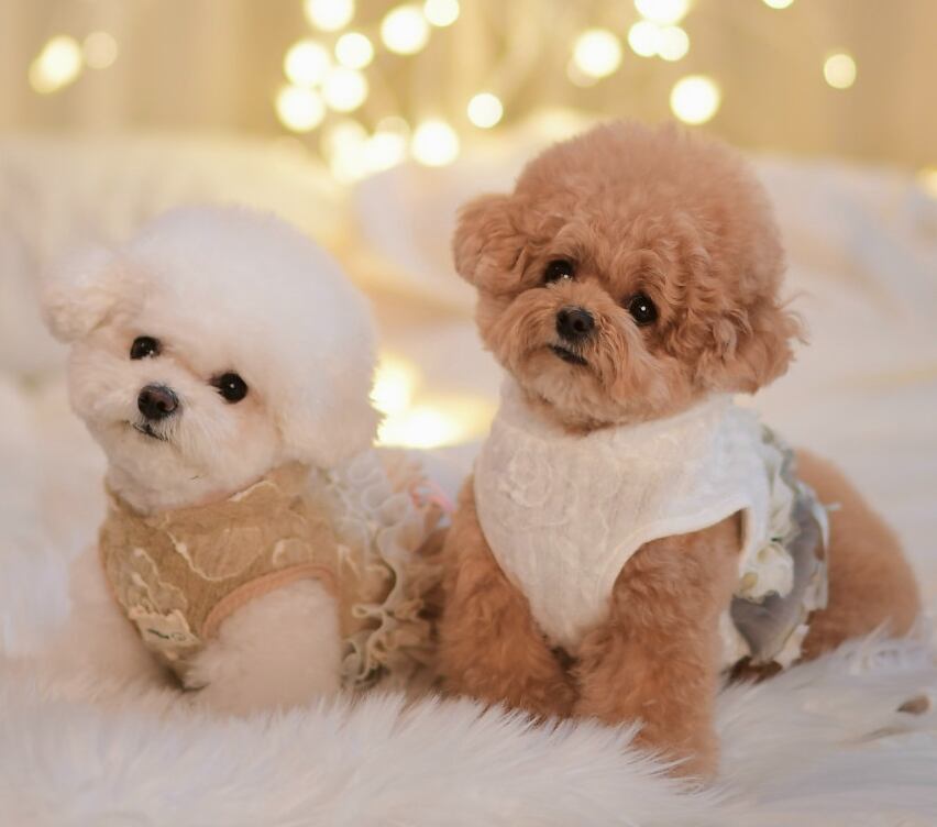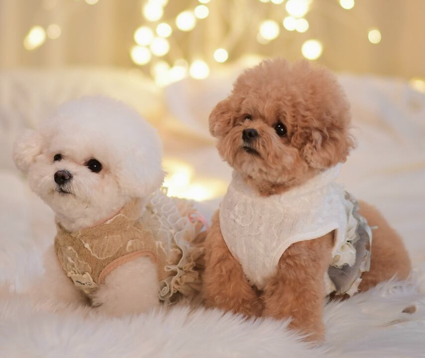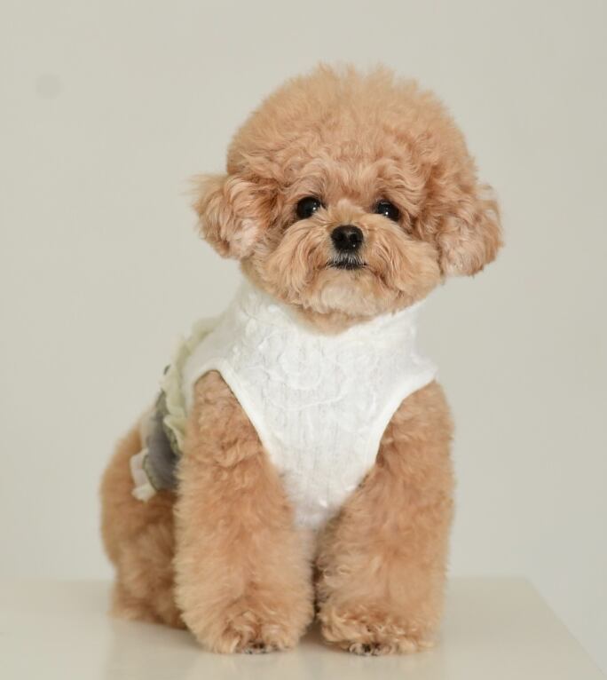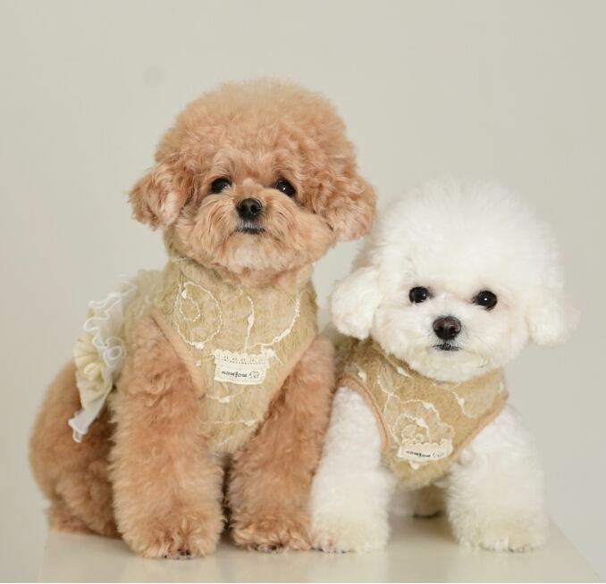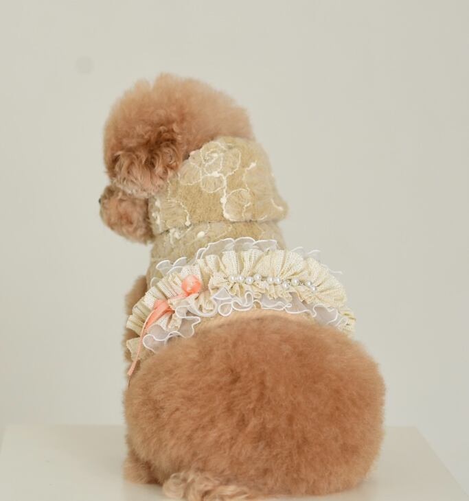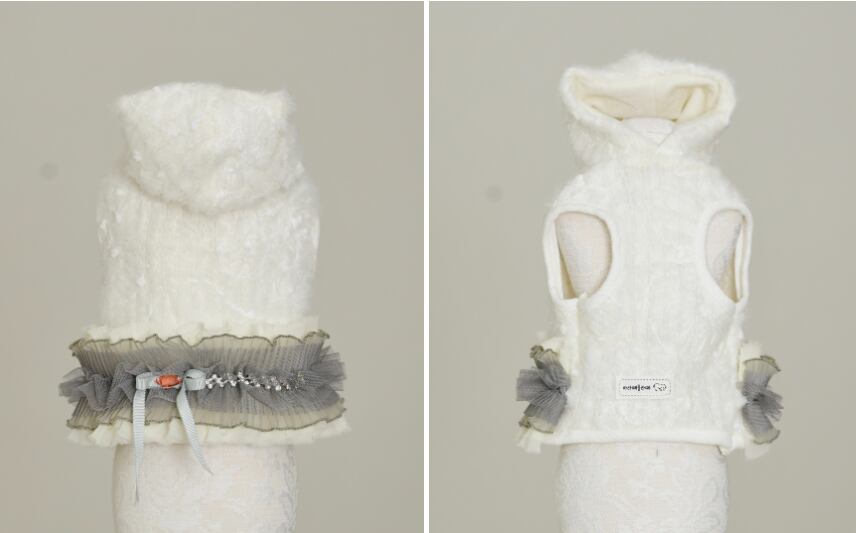 裾の幾重にも重なったフリルには、キラキラと輝くストーンとパール風の装飾をプラス。歩くたびに煌めき、ワンちゃんの可愛さを最大級に引き出します。 お袖のないベストタイプなので、重ね着もしやすく、動きやすさもバッチリです。