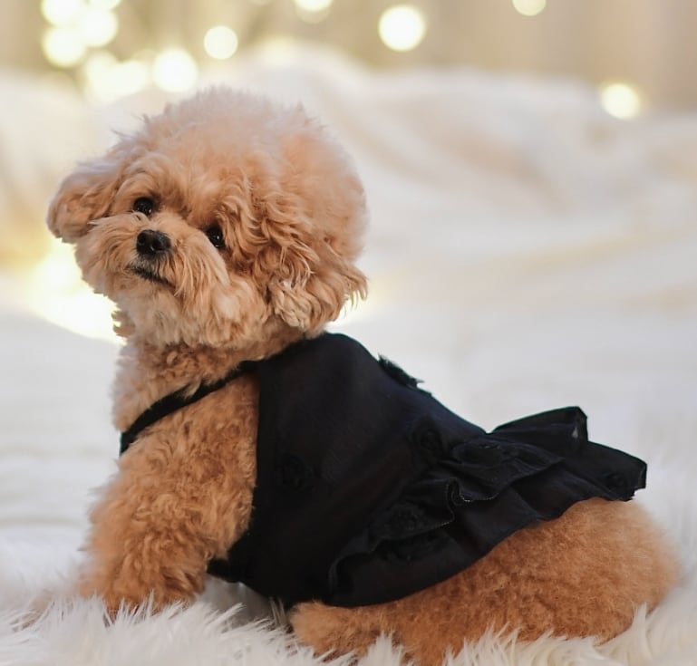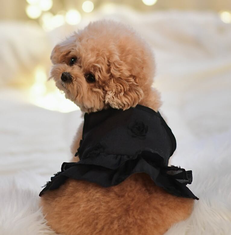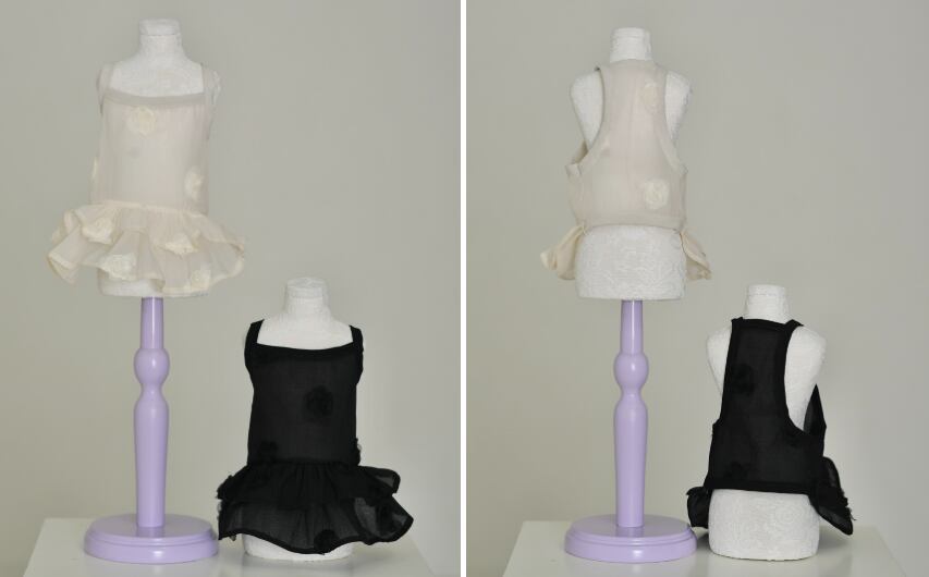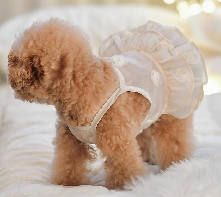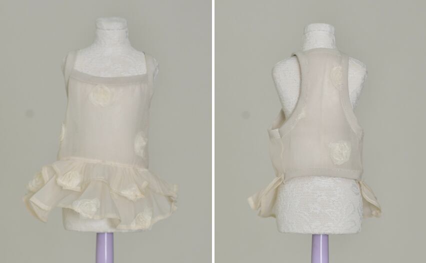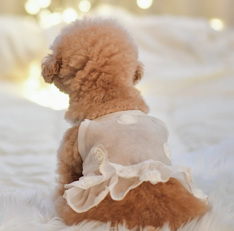 最大の魅力は、歩くたびに軽やかに揺れる2段のティアードフリル。 透け感があるため、ワンちゃんの毛色によって表情が変わり、単体での着用はもちろん、インナーに薄手のカットソーを合わせたレイヤードスタイルも美しく決まります。