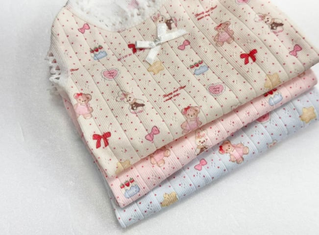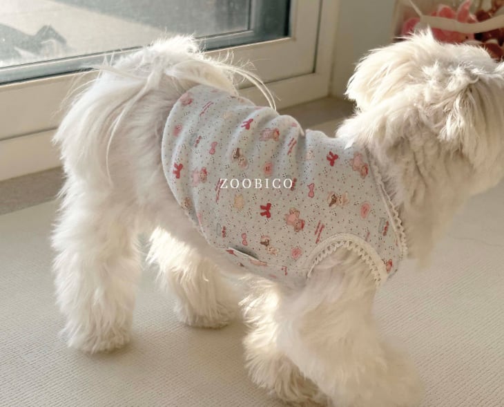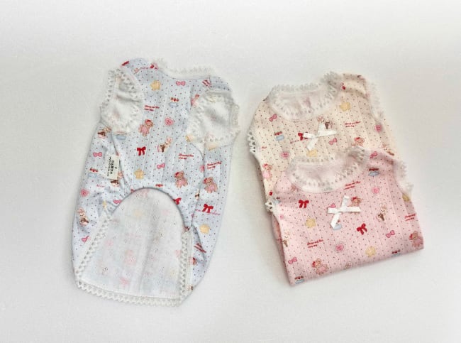 優しいパステルカラーの生地に、愛らしいくまさん、ウサギさん、そして赤いリボンを散りばめた、心ときめく総柄タンクトップが登場しました。 胸元の小さなリボンと首回りのレースが、ワンちゃんをより一層可憐に引き立てます。