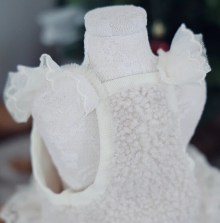 思わず触れたくなるような、ふわふわのポグル生地を使用した冬の主役級ワンピース。 真っ白で柔らかなボアに、繊細なレースフリルを贅沢にあしらいました。